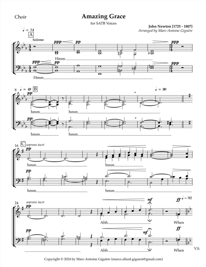 Cet extrait d’Amazing Grace est une partie d’une oeuvre plus large arrangée par Marc-Antoine Giguère.